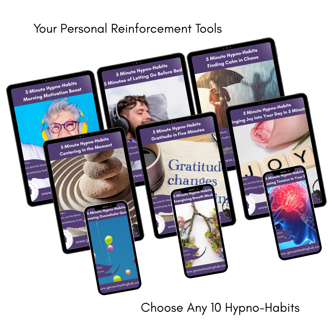 As part of your Evolve & Ebody journey, you’ll also receive your choice of any 10 hypnotherapy audios from the GenZen Healing Hub library — giving you powerful support between sessions and long after they end. These audios become your personal reinforcement tools, helping you anchor new beliefs, calm your nervous system, strengthen boundaries, and deepen the shifts we create together. Choose the ones that speak to where you are now, press play when you need grounding or momentum, and allow your transformation to continue unfolding in your own time, in your own space.